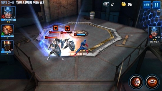 전투는 3명의 영웅이 한팀이 되어 돌아가는 방식으로 싸우게 된다.기본 공격이나 스킬은 각 캐릭터가 영화에서 보여주는 전투 방식 그대로를 보여주고 있어 플레이의 재미를 더한다.