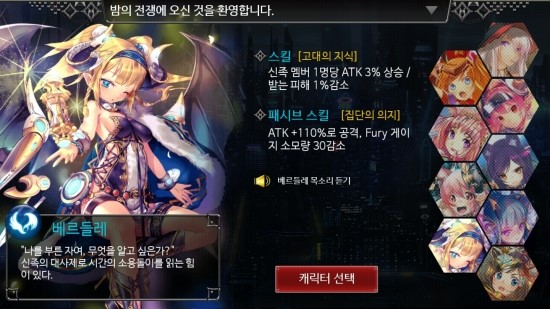 처음에는 9개의 캐릭터 중 리더 캐릭터를 골라야 하는데 각 캐릭터들은 외형부터 목소리까지 미리 확인할 수 있어 디테일하게 자신의 취향과 일치하는 캐릭터를 선택할 수 있다. 물론 본격적인 게임에 들어서면 리더급 캐릭터 카드를 얻을 수 있는 임무나 금화(게임 머니), 루비(게임 머니), 게임 캐쉬(다이아몬드)를 소비를 통해 다양한 캐릭터를 얻을 수 있다.