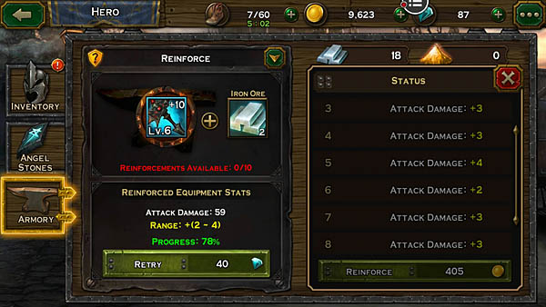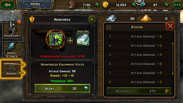 ▲ 강화는 최대 10까지 가능한데 아이템 마다 수치의 폭이 있고 그 중 무작위로 정해지는 형태다. 예를 들어 녹색 무기의 경우 강화 시 공격력이 2~4 사이의 값 중 하나가 무작위로 오르게 된다. 10이 되면 매번 오름 대미지를 확인할 수 있다.