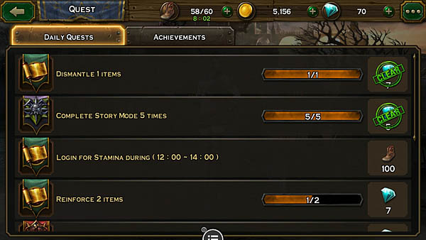▲ 게임 플레이의 또 다른 동기부여가 되는 일일 퀘스트와 업적 시스템은 처녀작인 헬로히어로처럼 잘 구현돼 있었다.