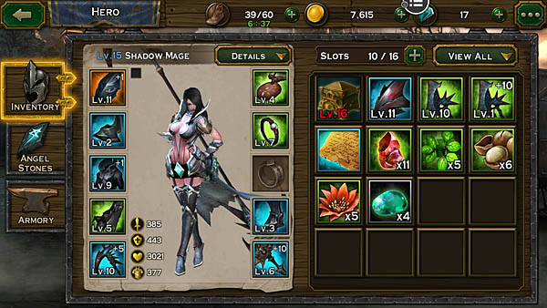 ▲ 엔젤스톤은 머리,어깨, 가슴, 장갑, 무기(양쪽), 목걸이, 반지, 신발 등의 부위에 아이템을 착용한다. 또한 장비는 기본적으로 강화나 제작이 가능하다.