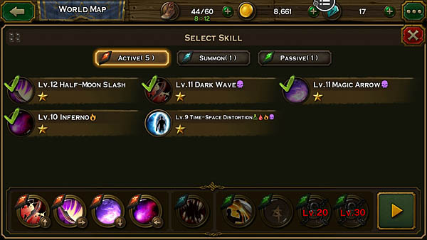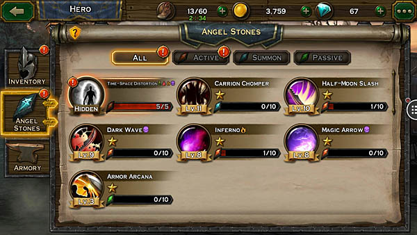 ▲ 스킬은 크게 액티브와 패시브, 소환으로 구분되고 액티브스킬은 4개, 소환 스킬은 1개, 패시브는 초대 4개까지 장착할 수 있는데 각 사냥터에 효율적인 스킬을 선택하는 전략적인 요소가 엔젤스톤이 추구하는 재미 가운데 하나로 알려져 있다.