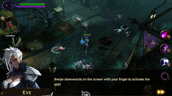 ▲ 가볍게 전투를 시작한다. 스킬은 UI(유저인터페이스) 우측에 있어 이를 터치하면 되는데 스와이프 기능을 통해서도 기술을 사용할 수 있다. 터치와 스와이프 모두 제공해 게임 플레이 상황에 따라 편리한 걸 선택할 수 있다.