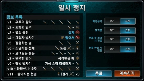 콤보는 '검-검-검-쌍검'같이 일정한 패턴이 있고 종류에 따라 공격범위와 스피드가 다르다. 결국 어떤 콤보를 어떤 상황에서 써주느냐를 순간적으로 판단하는 능력이 필요하다. 콤보리스트는 일시 정지를 눌러 확인할 수 있다.