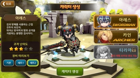 캐릭터는 전사 '아레스', 마도사 '티리아', 궁수 '카인' 3종류다. 아레스와 카인는 처음부터 고를 수 있지만 키리아는 합산 레벨이 15이상 돼야 선택할 수 있다. 전사, 궁수, 마도사라는 꽤나 진부한 조합이지만 공격 스타일이 전혀 달라 캐릭터를 바꿀 때마다 새로운 느낌으로 즐길 수 있다.