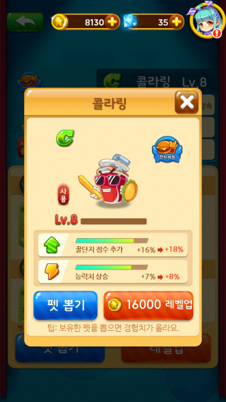 또한 캐릭터는 레벨업을 통해 가진 능력을 업그레이드시킬 수 있으며 30레벨 달성 후에는 진화도 가능하다. 진화 후에는 캐릭터의 외형이 바뀌는 것은 물론 게임상에서 사용 가능한 스킬이 열리거나 골드를 많이 획득할 수 있는 보너스를 얻게 된다.