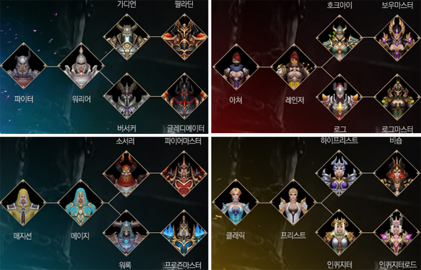 ◆ 4차 직업까지 마련된 전직 시스템, 총 16개로 분류되는 직업군