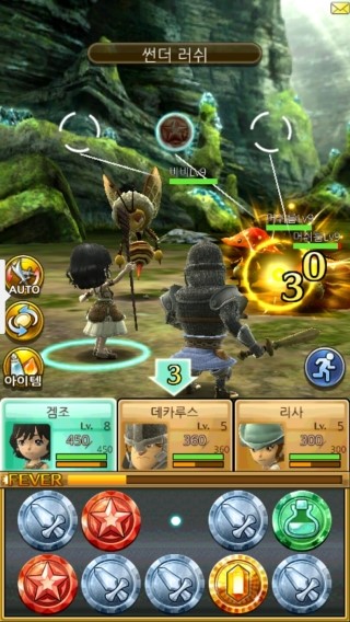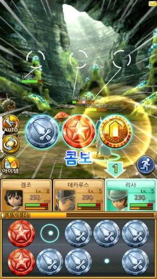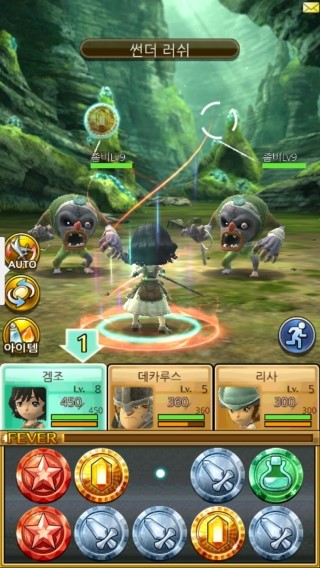 전투는 하단의 메달을 던지면서 시작된다. 메달은 스킬 개념으로 원하는 공격 메달을 선택해 몬스터를 향해 슬라이드하면 해당 공격이 적중하는 개념이다. 물론 아무렇게나 던지는 것이 아니라 공격할 대상의 몬스터의 머리 위쪽으로 나타나는 동그란 조준점으로 던져야 적에게 많은 대미지를 줄 수 있다.