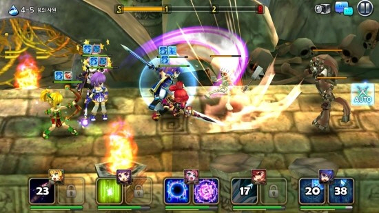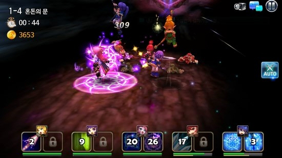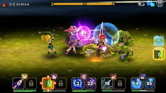 이렇게 처음 튜토리얼을 통해 총 4명의 영웅이 주어지나 파티는 5명까지 구성이 가능하다. 배치는 앞쪽에 근접형 영웅이 2명 뒤쪽에 원거리형 영웅이 3명이 배치되는 방식이다. 파티편성은 영웅 속성에 따라 자동 편성으로 쉽게 편성할 수도 있다.