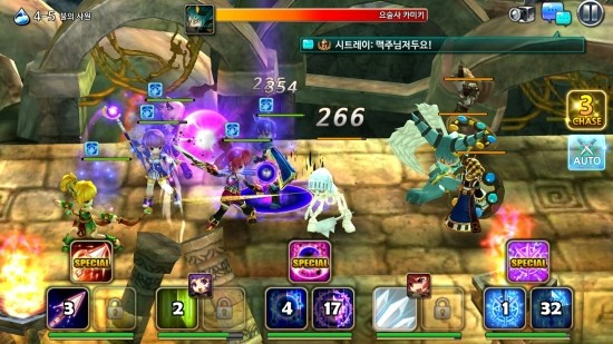 전투는 일반 공격만 항상 자동으로 이뤄지며 오토모드를 활성화할 경우 일반 스킬과 패시브 스킬까지 자동으로 이뤄진다. 하지만 가장 강력한 공격인 스페셜 스킬과 체이스 스킬은 게이머가 직접 눌러줘야 한다.