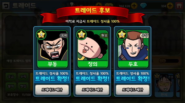 장수를 트레이드하는 과정에도 별다른 조건이 없다. 갖고 있는 장수를 재료로 넣으면 최대 2단계까지 높은 등급의 장수를 얻는데, 레벨이나 강화 단계가 없으니 손쉽고 간편하기만 하다. 거기다 무작위로 결과물을 받는 것이 아니라, 3개의 후보 중 자신이 원하는 것을 선택해 받을 수 있어 성장에 대한 스트레스를 크게 줄였다.