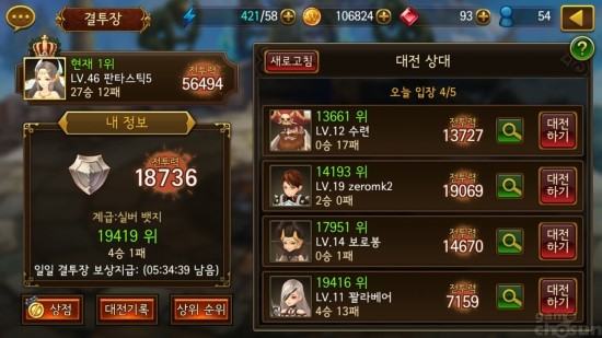 전투는 하루에 다섯 번만 진행이 가능하며 한 번 전투를 하고 나면 10분의 대기 시간을 가진 뒤 다시 다른 유저와 전투를 겨룰 수 있다. 또한 자신의 순위에 따라 주어지는 결투장 포인트로는 결투장 상점에서 다양한 아이템과 영웅 조각을 구매하는 것이 가능하다.