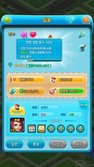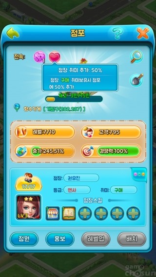 점장 또한 아무나 채용하는 것이 아니라 해당 점포에 어떤 취미를 갖고 있는 직원이 더 효과적인지 확인 후 채용해야 한다. 이는 마찬가지로 수익에 영향을 주기 때문으로 점포 화면에서 왼쪽 상단의 하트 모양 마크를 통해 확인할 수 있다.