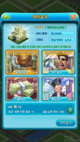 먼저 술자리 유혹과 뇌물제공으로 공격한다면 해당 점포에 있는 직원들의 충성도를 일정 깎을 수 있다. 이때 술자리 유혹은 직원의 충성도가 200 이상 일 때는 효과가 나타나지 않는다. 유언비어와 품질검사는 점포의 지명도를 깎는 일로 유언비어 또한 지명도 200 이상 시 효과가 발휘되지 않는다.