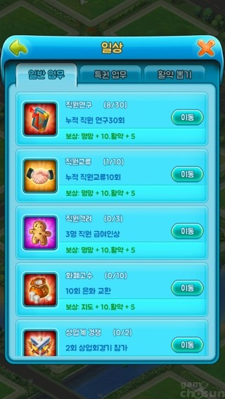 업무를 수행할 때 이동 버튼이 있어 누르면 바로 업무를 수행할 수 있는 곳으로 이동되는 것이 아니라 업무를 수행할 수 있는 메뉴로 이동하게 된다. 따라서 게이머는 그 메뉴에서 업무를 수행할 곳으로 다시 이동해야 한다.