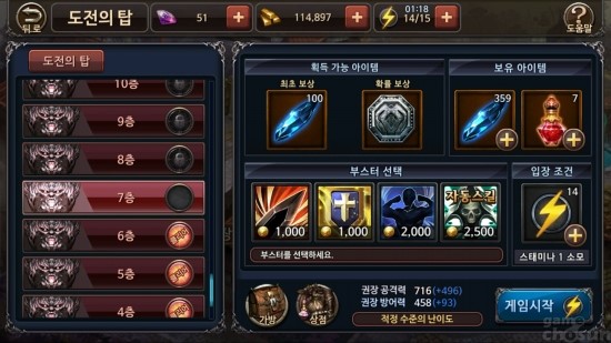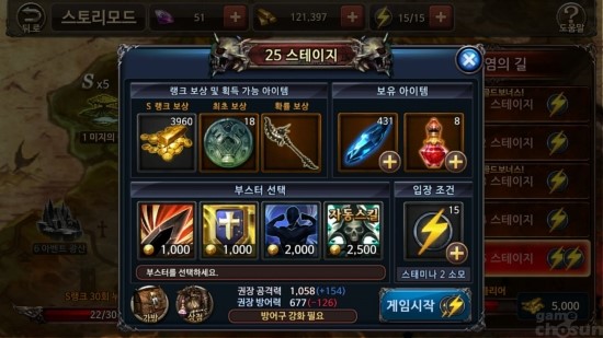 만약 강화할 아이템이 존재하지 않는다면 공격력 5% 증가나 방어력 5% 증가 부스터를 사용하여 스테이지를 클리어해야 하는데 권장 수치와 자신의 능력치 차이가 꽤 난다면 부스터를 구매한다 할지라도 크게 도움받을 순 없다.