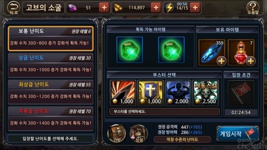 물론 난이도에 따른 강화수치가 높은 강화석을 얻을 수 있으나 권장 공격력과 방어력을 확인 후 입장하는 것이 좋다. 고브의 소굴은 입장하면 미처 클리어하지 못했더라도 다섯 시간 동안의 긴 쿨타임을 가지므로 자신에 맞는 난이도를 선택하여 강화석을 획득하는 것이 중요하다.