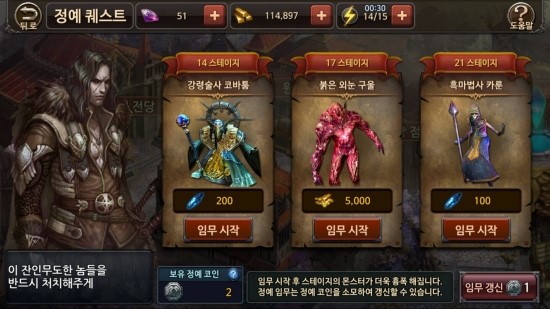 마지막으로 정예 퀘스트는 보유한 정예 코인으로 임무를 갱신하여 플레이할 수 있는 콘텐츠로 총 3개의 던전이 등장하는데 각기 어떤 보상을 받을 수 있는지 확인 후 입장할 수 있다.