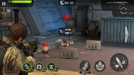 먼저 척탄병은 수류탄을 던지는 캐릭터로 게이머가 있는 쪽으로 수류탄을 던지는데 피하지 못하면 체력이 깎인다. 게이머는 화면의 양 끝의 화살표로 왼쪽과 오른쪽으로 위치를 옮겨 다니며 피할 수 있다.