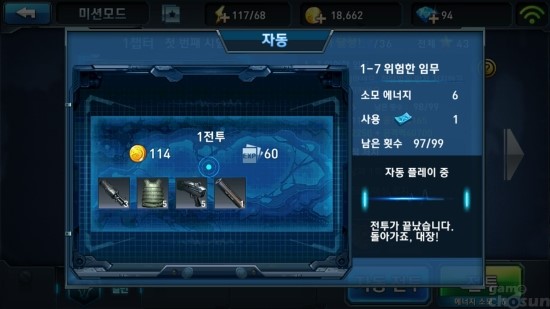 스테이지마다 주어지는 미션을 모두 완료했다면 다음 플레이 때 자동 전투를 진행할 수 있다. 자동 전투는 티켓을 소모하여 사용할 수 있으며 플레이를 하지 않고도 보상만 획득할 수 있다.
