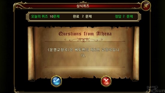 아테나퀴즈는 OX 퀴즈 형태로 매일 10문제가 출제된다. 문제는 일반 상식 문제와 블러드레이드에 관한 문제로 구성되어 있는데 문제를 맞힐 때마다 골드를 획득할 수 있으며 틀렸을 경우 5초의 페널티 이후 문제가 출제된다.