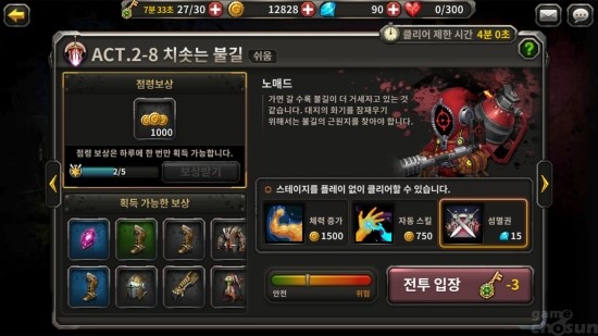 보스 공략까지 마쳤다면 이후에는 자동 전투를 이용할 수 있다. 그러나 스킬은 게이머가 직접 써줘야 하거나 자동 스킬 아이템을 구매해야 한다. 또한 한 번 공략한 스테이지는 섬멸권을 이용하여 직접 플레이하지 않고도 보상을 획득할 수 있다.