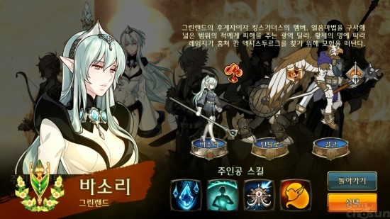 킹스가더스의 리더인 '레이켈'은 강력한 검술로 적에게 피해를 주는 공격형 탱커, '바라카'는 빠른 쌍수 단검을 사용해 적에게 피를 주는 근거리 딜러, '시어칸'은 긴 창을 크게 휘둘러서 넓은 범위의 적에게 피해를 주는 중거리 광역 딜러이다.