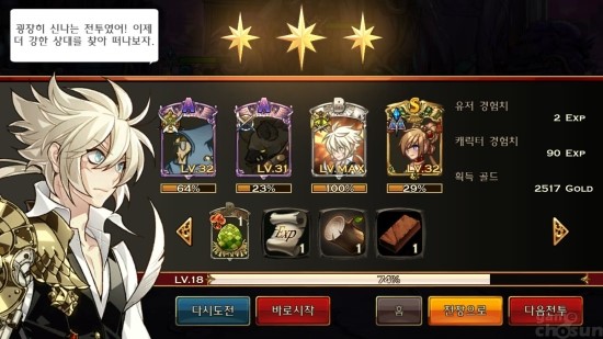 물론 엑소스사가는 전투를 통해 재미를 찾을 수 있는 게임이 아니라 다양한 캐릭터를 수집하고 성장시키는데 의의가 있는 게임이다. 이에 전투의 재미보다는 단순화된 전투를 통해 아이템을 모으고 모은 아이템으로 캐릭터 성장을 시키는 재미를 느껴야 한다.