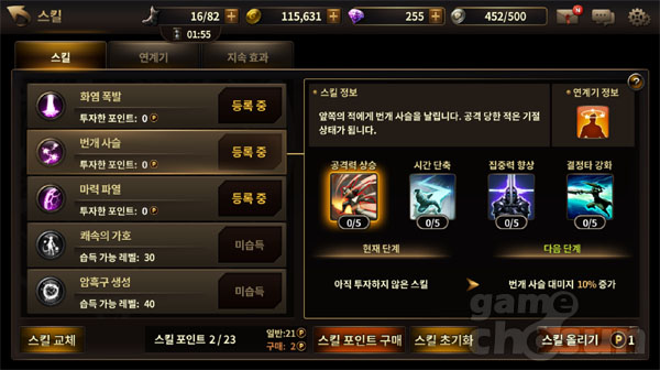 스킬 세팅은 스킬과 연계기, 지속 효과 3종류로 나뉘어 포인트를 투자하게 되어 있다. 레벨마다 1씩, 그리고 레벨 보상 외 추가로 50포인트를 구매하여 사용할 수 있다. 던전 사냥과 결투장 세팅이 다르고, 어떤 스킬을 투자하는가에 따라 달라지니 스킬 세팅에 정답은 있을 수 없지만, 잘못 투자하는 것이 아닐까 하는 걱정은 접어도 좋다.