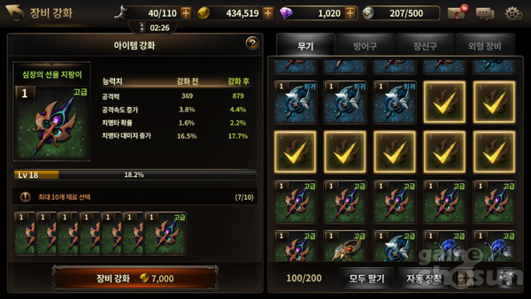 지극히 단순하다. 강화하고자 하는 장비의 등급에 따라 매 횟수 동일한 골드를 필요로 한다. 장비 최고 레벨인 20레벨까지 넣는 재료의 질에 따라 '경험치 효율'만 달라질 뿐 유일한 소모처인 골드는 언제 어떻게 몇 개를 넣더라도 동일하다. 즉, 재료만 준비됐다면 한번에 10개를 넣어도, 그때그때 1개만 넣더라도 손해 볼 것은 없다. 장비와 장비를 합쳐 바로 위 단계의 장비를 얻을 수 있는 합성 역시 마찬가지로 최대 레벨까지 성장시킨 동일 등급의 장비만 준비되면 골드'만' 소모함으로써 바로 합성이 가능하다. 스테이지 1~2판만 돌아도 내 캐릭터의 장비를 조금씩 성장시킬 수 있다는 얘기다.