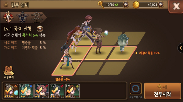 <총 9칸 중 5칸의 배치를 자유롭게 활용하여 전략적으로 자신만의 진형을 짤 수 있다>
