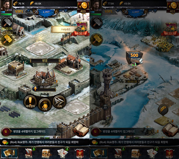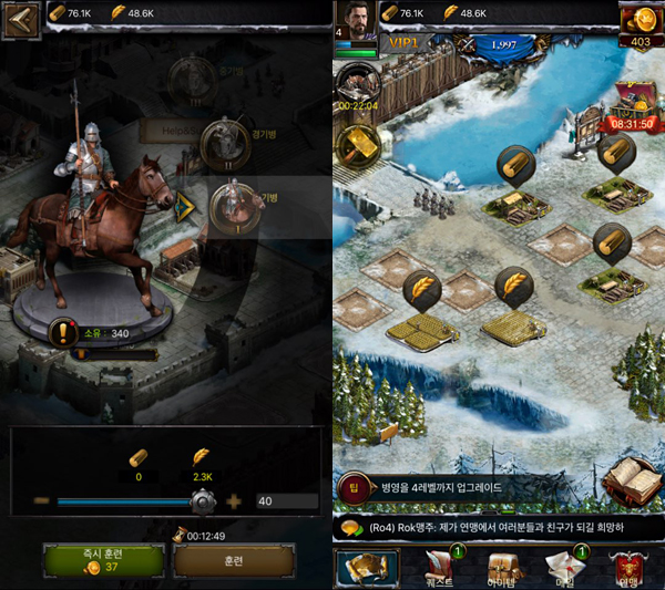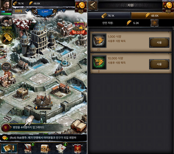 더불어 벌목장과 농지 건물 등 자원 확보 시설을 확장할수록 획득하는 자원이 늘어난다. 획득한 자원은 나만의 강력한 군대를 만들 수 있게 도와준다.