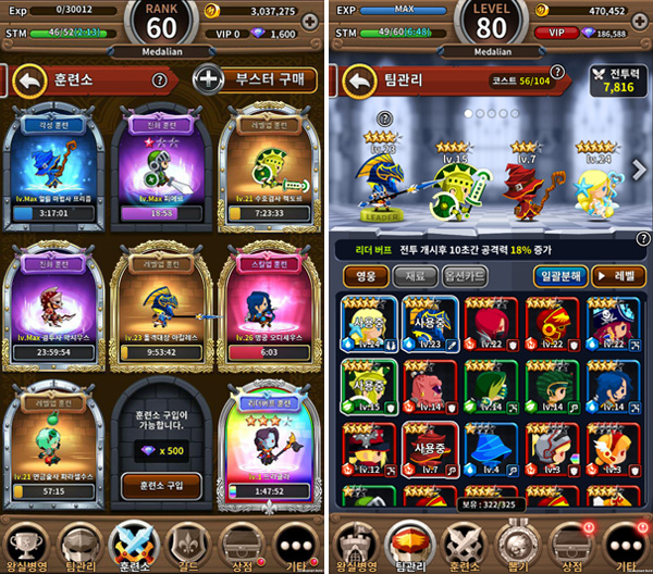 "급성장을 원하는 유저는 '모험'을 통해 레벨을 올릴 수 있다. 하지만 '메달마스터즈'에서는 영웅을 천천히 하나씩 키워나가는 재미도 있을 뿐만 아니라 자신의 조합을 바꾸기 위해 미리 키워놓는데 유용하게 쓰일 수 있는 것이 '훈련소' 시스템이다"