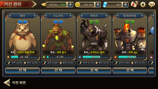[다양한 종류의 거신. 각자 고유의 버프로 전투를 유리하게 유도]