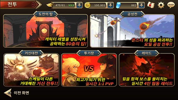 ‘도전의 탑’은 총 80층으로 구성된 탑으로, 각 층마다 다양한 보상과 다양한 난이도의 적들이 설정되어 있어, 유저의 성장에 따른 순차적 공략이 가능하다. 탑 공략법을 연구하는 재미를 제공한다.