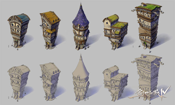 마지막은 ‘나무와 돌로 지어진 친숙한 느낌의 집들’입니다. 기와로 지은 듯한 울쑥불쑥한 느낌의 집들은 동화속 마을과 같은 재미있는 느낌을 주고자 했습니다. 신기하고, 빛나는, 조금은 이해하기 어려운 곳이지만, 자세히 보면 친숙하고, 익숙한 집들이 올망졸망 늘어서 있지요. 색감도 전체적으로 밝고, 따뜻한 느낌을 주고자 노력했습니다.