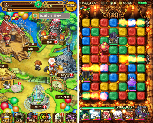 '포코롱던전'은 퍼즐 내 같은 색 타일을 연결해 이용자와 해당 색 타일 속성의 몬스터가 적을 공격하는 방식이다.