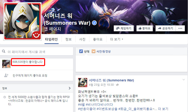 ▲ 서머너즈워 공식 페이스북. 60만명 이상 좋아요를 눌렀다.