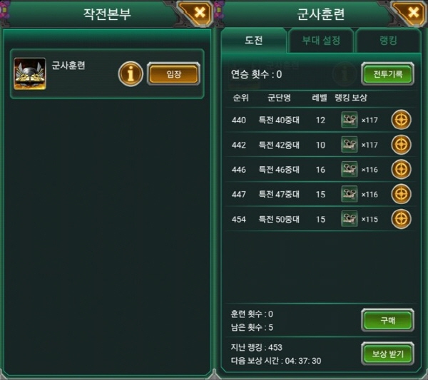 군사훈련에서는 다른 유저와의 모의 대전을 통해 업그레이드에 필요한 부속품을 획득하고 육성이 잘 되었는지 판가름 할 수 있게 해준다.