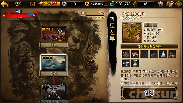 추가 시나리오를 즐기기 위해선 해당 장수를 영입해 조건을 충족시켜야 한다. 이는 시나리오를 차례로 공략하면서 자연스럽게 해결되지만, 시간 단축을 원하는 유저라면 금전(과금)를 소모해 장수를 영입하고 추가 시나리오를 개방할 수 있도록 구성했다.
