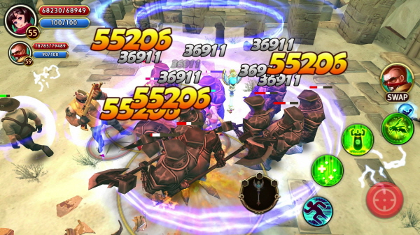 캐릭터간 조합을 활용한다면 더 짜릿한 전투를 체험할 수 있다. 이른바 ‘메즈기’(상대의 발을 묶는 기술)로 몬스터 무리를 잡아두고, 화력이 강한 캐릭터로 이를 쓸어버리는 몰이사냥의 쾌감이 헌터스 어드벤처의 백미이다.