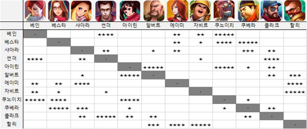 ▲ '헌터스어드벤처'에 등장하는 12종의 캐릭터 간 케미를 정리했다. 별 개수에 따라 생명력과 공격력이 각각 +7%, +9%, +12%, +15%, +18%씩 증가한다.