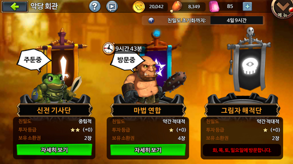 이 게임의 가장 큰 핵심은 수집형 RPG이다. 악당(캐릭터)들을 수집해 등급을 올리고, 보다 강한 자신의 파티를 꾸리는 것을 큰 맥으로 삼는다.