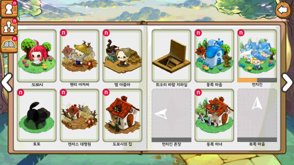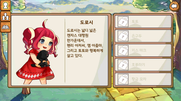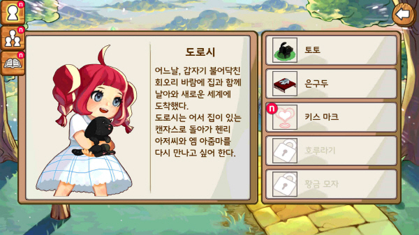 게임을 진행하면서 겪는 일들은 도감에 저장돼 언제든 확인할 수 있다. 도로시, 허수아비, 나무꾼, 사자 등 주인공 캐릭터는 물론 들쥐, 초록 안경 등 비주류 캐릭터와 사물들까지 저장되기 때문에 스토리를 복기하는 데 유용하다. 또, 이를 하나씩 완성시키는 재미도 가지고 있다.