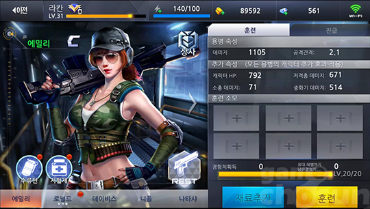 빼놓을 수 없는 것은 성장 요소다. 먼저 주인공이 사용하는 각종 화기와 기본 장비는 물론이고, 같이 전장에 출격하는 파트너도 성장시킬 수 있다. 공격력부터 방어력, 각종 스킬과 상황 대처 능력이 모두 상승하기 때문에 보다 쉬운 플레이, 더 높은 점수를 위해서는 강화는 필수 요소가 된다. 물론 정도 이상의 성장을 원한다면 과금으로 연결되는 부분이기도 하다.