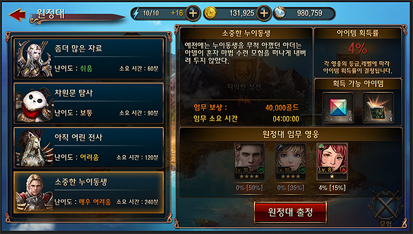특히 이번 테스트에서 처음으로 선보이는 '원정대' 콘텐츠는 시나리오에서 습득하는 영웅(캐릭터)마다 서브 스토리를 추가한 것으로 캐릭터 성을 강화한 서브 미션 콘텐츠다. 원정대는 매일 난이도가 달라지며 보상으로 각성석을 획득해 장비 강화 재료로 활용할 수도 있다.