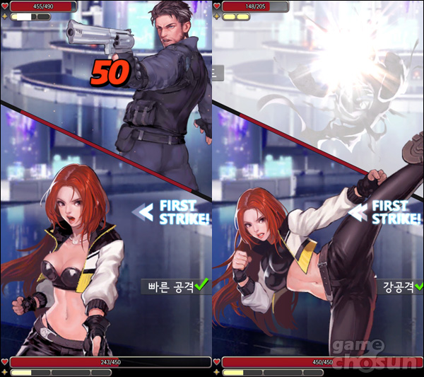 우위 상성은 가위바위보의 규칙과 같다. 각 상성은 '빠른공격> 강공격, 강공격> 방어, 방어> 빠른공격'이 기본 상성. 여기에 스테미너 시스템이 있어 낼 수 있는 카드를 예측하는 전략성도 더했다.