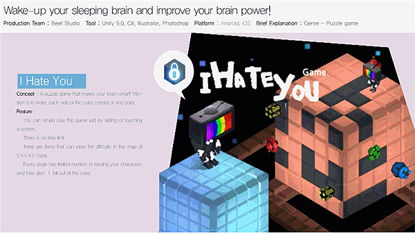 마지막으로 'I Hate You'는 제한된 횟수 내 큐브의 모든 면을 하나의 색으로 통일시키는 두뇌 자극 3D 퍼즐게임으로 지난 2월, 캐주얼 게임 전문 컨퍼런스인 '2016 Casual&Connect'에서 Indie Prize 특별상을 수상한 바 있다.