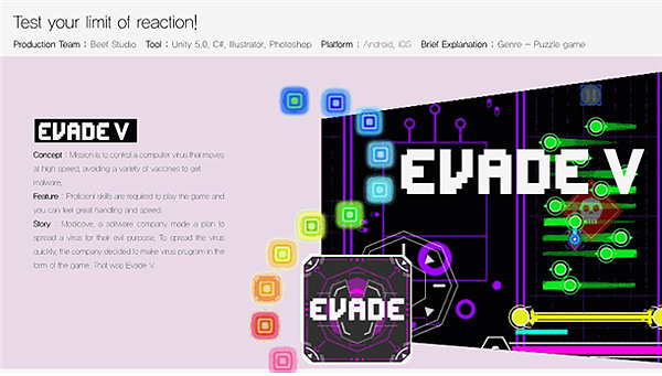 'EvadeV'은 컴퓨터 바이러스가 백신들을 피해 악성 코드를 습득한다는 내용의 게임으로 중독성이 뛰어난 아케이드 게임이다.
