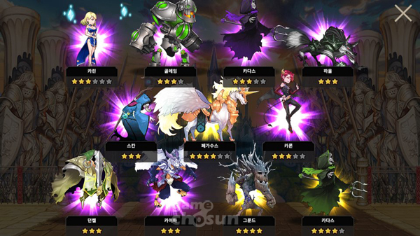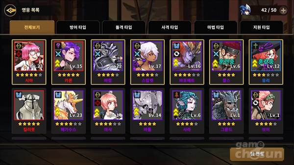 103여종의 영웅들은 방어와 돌격, 사격, 마법, 지원 타입으로 구분되며, 태생에 따라 1성에서 6성까지 승급시킬 수 있다. 기존 게임들처럼 승급할 때마다 외형도 화려해져 유저들의 수집욕을 자극한다. 특히 게임 초반 지급하는 '5성 시아'의 경우 6성으로 승급하면 안경을 벗고 분홍색 기체에 타고 있는 모습으로 변신하기도 한다.